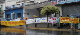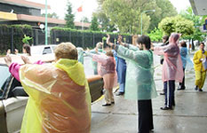 ![]() 中使馆前,法轮功学员在雨中举横幅抗议迫害 |