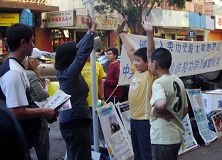 因为星期六开法会,法轮功学员没有亲自发报,后来一些华人在星期天看到他们,非常高兴,他们原以为法轮功学员不来了。中使馆想赶走法轮功,曾唆使华人商家不准法轮功学员在人行道上发报、摆放看板。中使馆以为这里是中国,忘记了国外的人民有基本自由。全世界的法轮功学员在替千千万万在中国监牢里无辜受迫害的修炼人说话。只要迫害不停止,在国外的法轮功学员就一天不止的揭露中共的罪行。