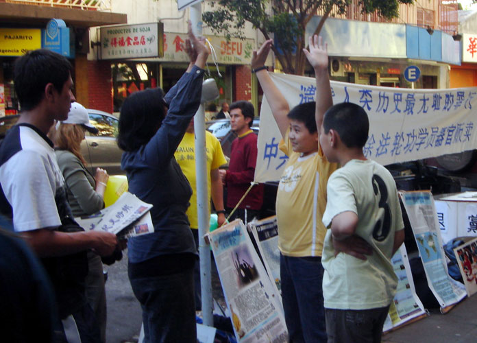 这一天,在中国城,阿根廷法轮功学员发出了上千份真相资料。整个的中国城在春天温暖的阳光下非常平和美好,大陆来的华人的态度也是友善的。这和一年前有很大的区别。那时法轮功学员在发报时常常遭到谩骂,一些华人是因为受到中共诽谤法轮功的谣言所影响,有的因为听到真相后,发觉那么多年被中共所欺骗,一时心里受不了,可是这些人现在心里平静后已经开始拿真相报纸了。有的和学员说,他们知道中共的无耻,也有的说他们都了解真相,又有的说他们都在骂中共。一年来法轮功学员不辞辛苦每周末等候华人,亲手把报纸送到他们的手上。开始有人不相信派发报的人都是自愿的在做,有的问,法轮功给你们多少钱?这一年下来这些人也看出这些修炼的人都是自愿的在发报。当然也有少数和中使馆来往密切的华人,为了利益关系,对法轮功学员态度恶劣。中共的日子已不多了,为了自保他们应该远离中共,不要被中共的假相所迷。