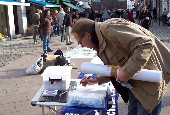 一位丹麦女士接过资料后,还多要几份带回去给朋友,让他们也了解在中国发生的事情。她表示,只有让更多的人知道,才能制止这些罪恶。