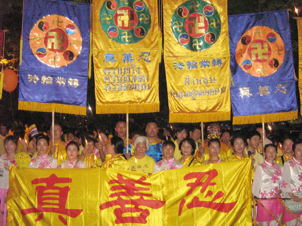 学员们以平静的心态对待这一切,不为所动。他们仍旧如期参加十二月五日的群众集会,他们依旧身着舞台盛装,带上横幅、幡旗,背上洪法资料,每个人手上都拿着金黄色的印有法轮图案和中泰两国“真善忍好”、“法轮大法好”文字的漂亮的礼品扇,乘着两辆大车来到了充满了喜庆和温良的泰国人民中间。