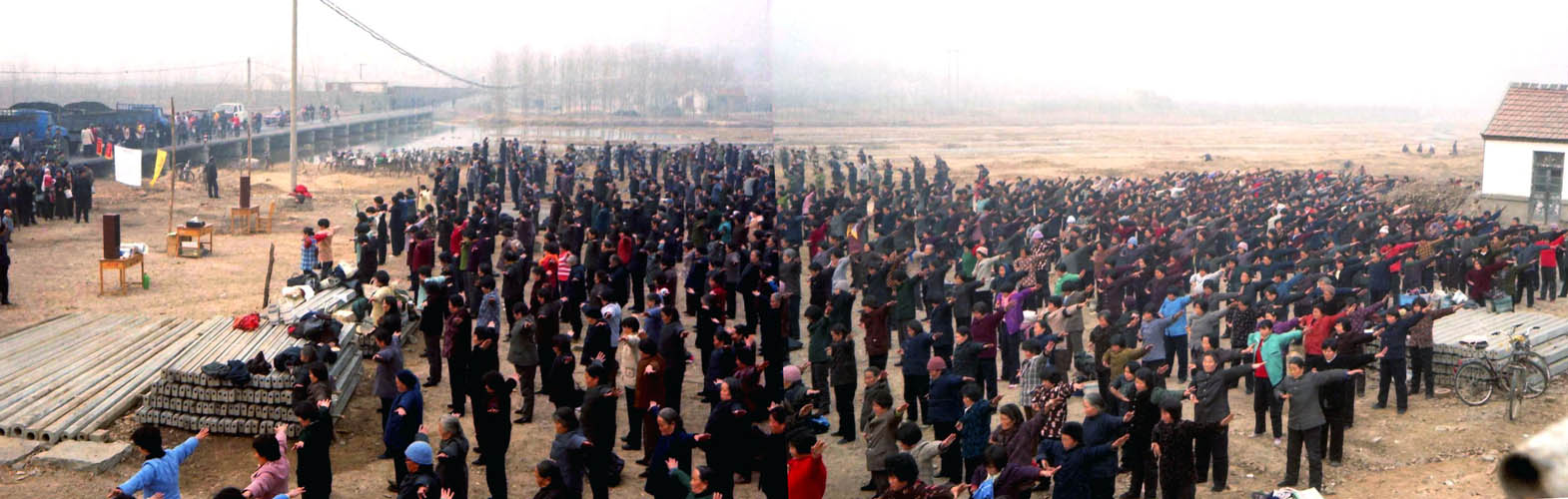 一九九八年春,山东省蒙阴县坦埠镇的法轮功学员在集市上炼功洪法的场面。一九九八年春,山东省蒙阴县岱崮镇法轮功学员在集市的一角炼功洪法的场面。一九九八年春,山东省蒙阴县野店镇的法轮功学员在集市旁边的河滩上集体炼功洪法并散发大法宣传材料。一九九八年元旦,数千名蒙阴法轮功学员在县城中心的汶溪公园集体炼功的场面。