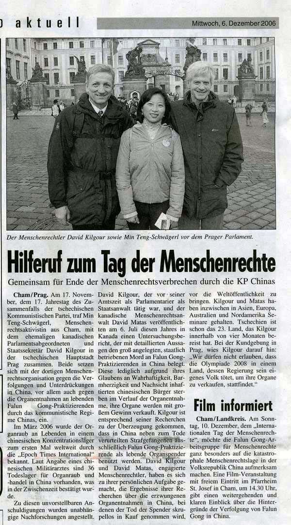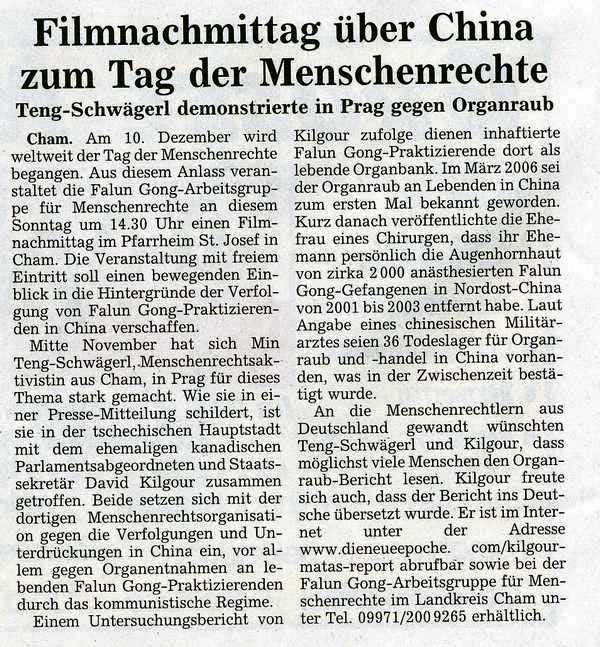 随着国际人权日的到来,德国卡姆地区(Cham)的国际人权协会(IGFM)以及法轮功人权组织强烈呼吁关注中国人权问题,关注法轮功修炼者等千千万万遭受中共邪党迫害的中国人的命运。呼吁得到了卡姆地区的报社、学校和教会的响应。卡姆时报(Chamland Aktuell),卡姆日报等纷纷刊登人权组织呼吁信,同时深度揭露中共恶党盗卖法轮功学员器官的惊天黑幕以及加拿大独立调查报告概要。