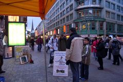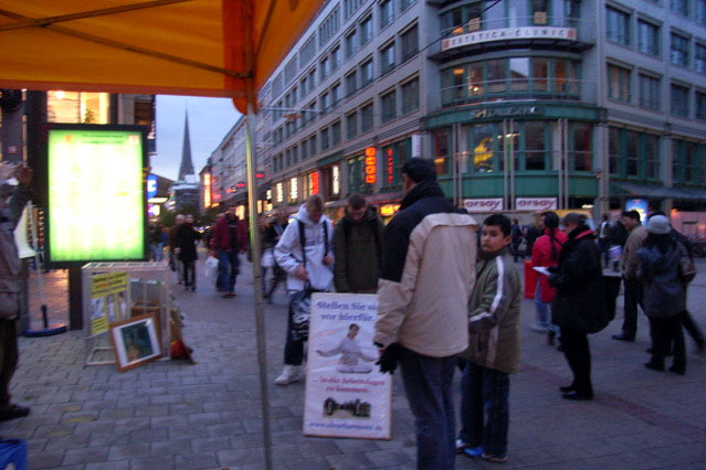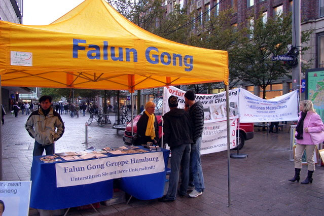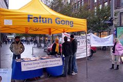 一个年轻女子和她母亲刚好路过,就在表格上签了名。“我经常见到法轮功。温家宝来汉堡的时候,你们在市政厅前抗议迫害,我也在旁边。此外我观看了你们在文化节的嘉年华游行,你们游行花车上的酷刑演示是相当震撼。”
