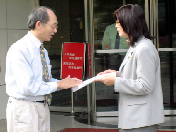 台湾法轮大法学会再度向新加坡驻台办事处递交抗议信,要求新加坡政府无罪释放被关押的法轮功学员,该处的秘书代表(右)接受
