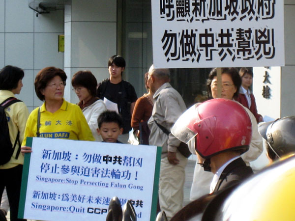 法轮功学员一日下午前往新加坡驻台办事处表达:新加坡政府协助中国共产党迫害法轮功是错误的!
