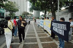 马来西亚法轮功学员在中使馆前拉着“停止迫害法轮功”、“强烈谴责中共活体摘取法轮功学员器官的暴行”,以及声援亚洲分团的成立的横幅表示支持。
