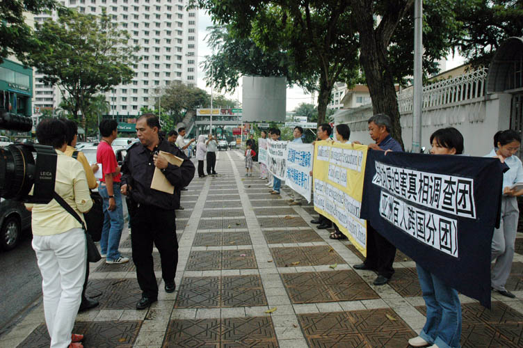 ![]() 法轮功学员到中国驻马大使馆前声援亚洲分团,有警员到现场了解情况 |