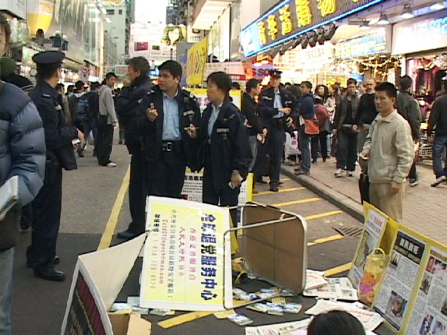 「十二月十九日傍晚,设在香港闹市区的退党服务中心摊位被一位大陆籍凶徒破坏踢翻,一位义工被打伤。在香港民众协助下,该凶徒被警员抓住并送往警署。上个月也曾遭遇类似袭击的受伤义工坚信:这是中共邪党特务操纵的事件。」