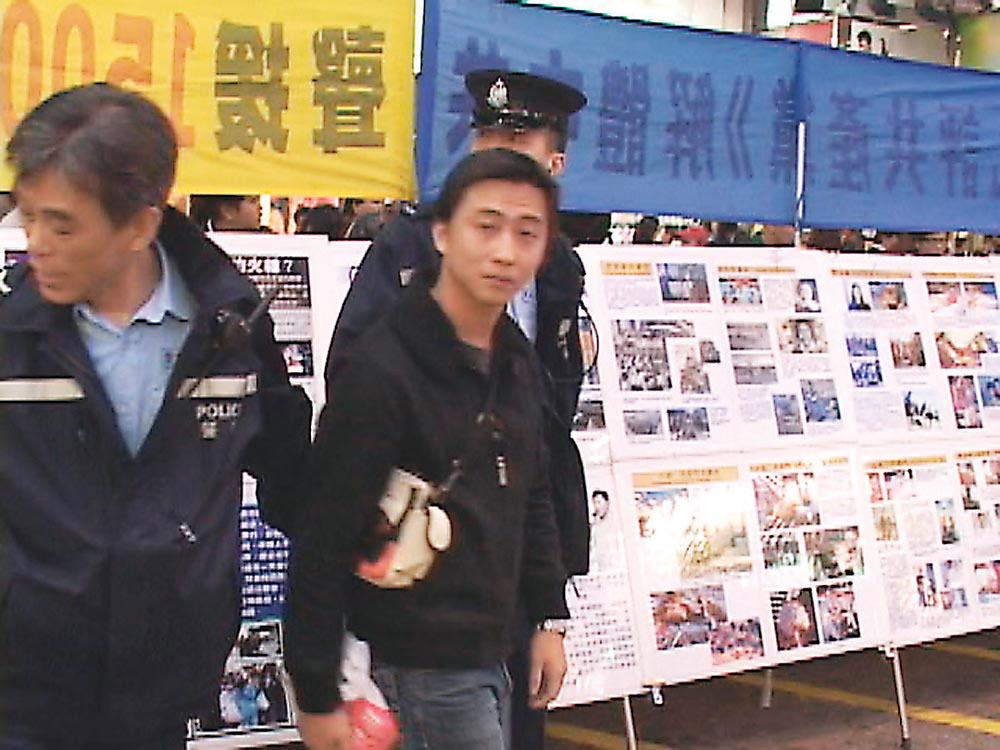 这次事件发生在十二月十九日,在旺角西洋菜街行人专用区摆设的退党服务中心摊位,突然被一名年约三十岁的中国籍男子捣乱,将摆放《九评共产党》小册子及光碟的台打翻在地,在摊位当义工的法轮功女学员诗时明追拿凶徒时,被对方出拳打伤。