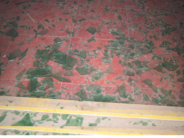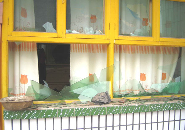 答:紧东边儿那块儿窗户都是着那砖头子揍的,碎了、那砖头子!