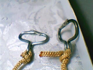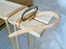 把辐条从中间对折(中间留孔),用钳子掐住对折的底部(掐住的部份稍大于木条厚度),再把上面的辐条向两侧掰,并做成椭圆形(椭圆形和钳子掐住的小圈不在同一个平面,互相垂直),把绳系在小圈上,并把小圈插進木条缝里,使绳在上板的一侧,椭圆形在木条一侧。上板两侧各做一个。如图一。