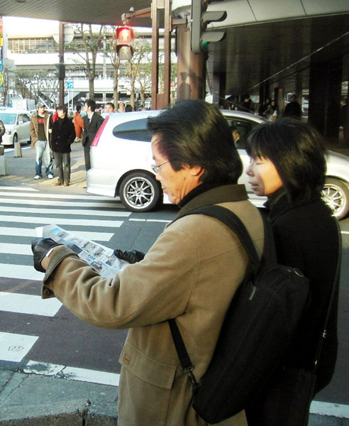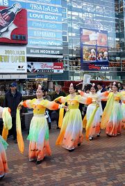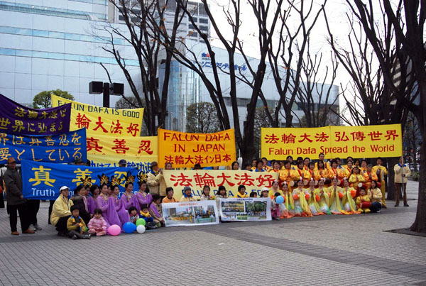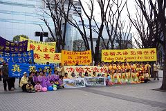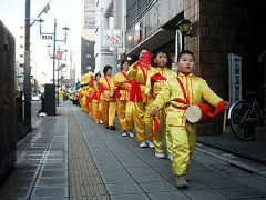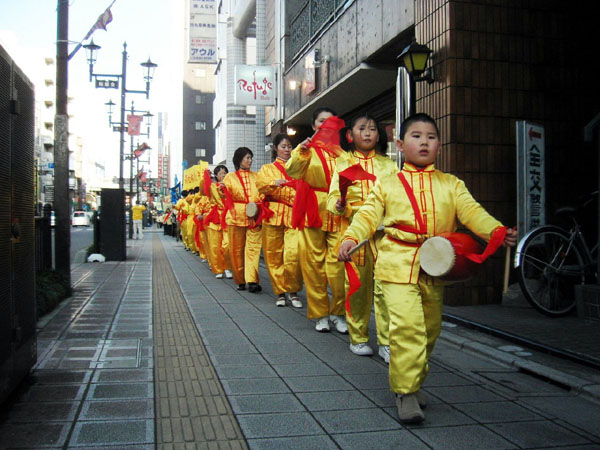 以日本首都圈为主,及来自爱知县、长野县等地的部份法轮功学员参加了当天的活动。在遍布红松和樱花树的风景秀丽的琦玉县大宫公园集体炼法轮功五套功法后,游行开始,队伍历经当地的繁华商店街,最后到达大宫车站附近的钟冢公园。由于这是法轮功学员第一次在当地游行,沿途伴随震撼人心的鼓点和婀娜的仙女舞姿,不断吸引民众前来问询,法轮功小弟子则沿途散发真相资料。两位来自大阪大学、回家乡度寒假的日本青年急切的向法轮功学员询问∶我们怎么能够成为你们中间的一员?学员张先生友善的向他们介绍了在日本各地的法轮功炼功点情况,欢迎他们自由参加。