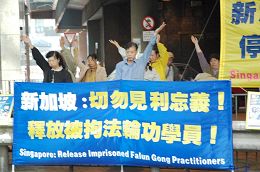 ![]() 法轮功学员在新加坡驻香港总领事馆外抗议 |