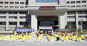 台中县议会前厅聚集中部县市法轮功学员百余人,以炼功方式和平请愿,台中县议员陈万通、谢志忠、詹敏丰、赖义鍠、高基赞、赖瑞珠等,纷纷前来关注,并同声谴责中共非法不人道的行径,是严重违反国际公约,应立刻停止迫害法轮功学员。