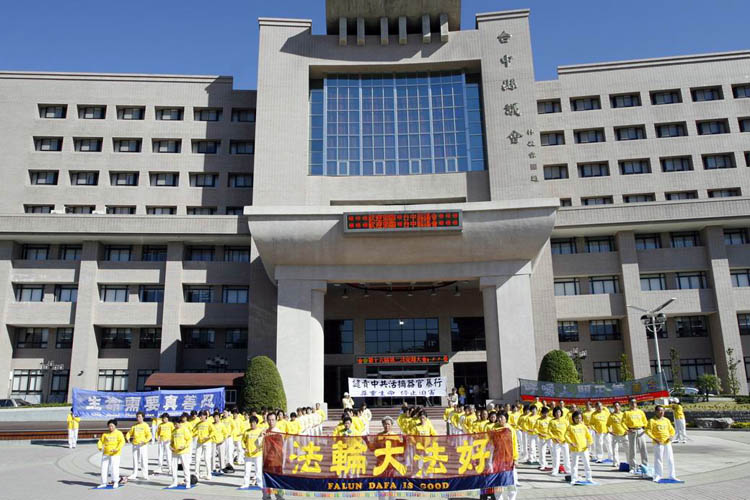 ![]() 六日上午台中县议会前厅聚集法轮功学员百余人, 以炼功方式,谴责中共活摘法轮功学员器官 |