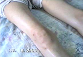 记者:镜头中的这位妇女名叫李萍,家住辽宁省大连市西港区。我们现在看到的是2003年9月13日,她在大连市姚家看守所和大连教养院被关押6个多月后,拍下的镜头。她的腋下和后部还留有被长时间吊打、折磨的痕迹。半个月前,她是用担架被抬出大连教养院的。