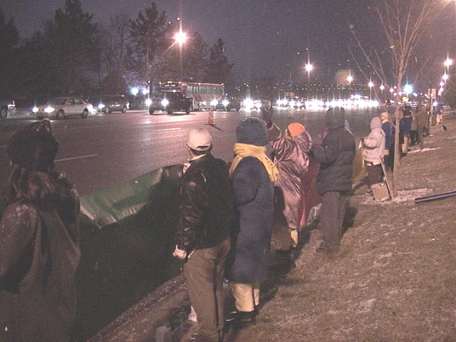 冒着摄氏零下10度的低温,詹为守和来自各地的法轮大法弟子从早上出门开始,便在寒风、冰凌和鹅毛大雪中屹立十多个小时,为保持队形,许多学员十几个小时下来中间没吃上一口饭。或许是被大法弟子赤诚的心所感动,当开幕式结束,各国代表团离开会场时,看到路边的横幅、烛光,漫天飞舞的鹅毛大雪和面带微笑向他们招手的学员,来自不同国度、不同种族的运动员们也纷纷做着各自祝福的手势表达自己的敬意,有不少人喊:“祝福你们!”“我们支持你们!”车辆则轻声鸣笛以示支持。詹为守说,我们一直等到午夜十二点各代表团都离去以后才结束请愿。