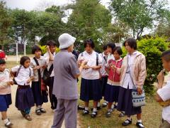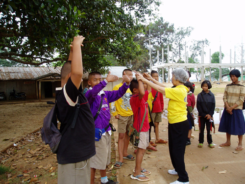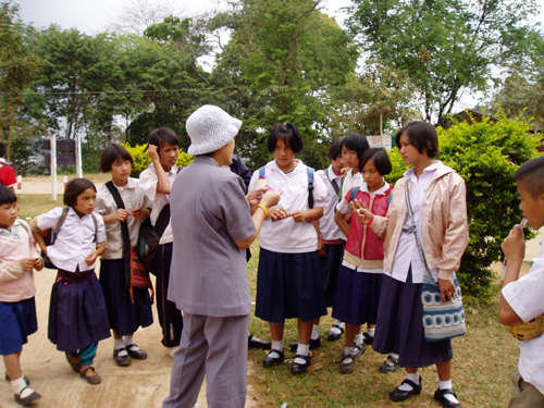 这次洪法碰到的教师、学生较多。在清莱万汕滴基里学校,我们到半山腰校长办公室去讲真相,下山到学校操场炼功教功。在素可泰古都,有几位教师带着上百个学生骑自行车游览,我们把大法资料和洪法书签都送给了他们,师生们双手合十表示感谢。