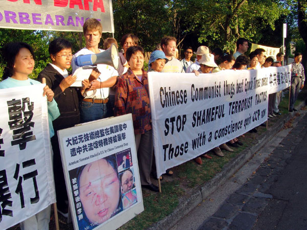 2006年2月15日傍晚时分,澳大利亚墨尔本法轮功学员在中领馆门外举行抗议活动,抗议中共流氓特务对海外法轮功学员所采取的黑帮行径,抗议活动在晚上9时后结束。