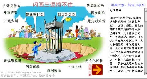 该邮件闪画不是动画片,而是类似教学的互动画面,可用IE浏览器打开,在第一页读者可点击三退有关内容,了解真相,第二页是三退页,读者可以选择所退内容,并发送,此时邮件闪画将打开用户的本地邮件服务(如OUTLOOK),自动提供三退邮件地址,并由用户确认后,发送一串由邮件闪画提供的数码,接收方(退党中心)收到数码邮件就可以解读你的三退信息,并用此数码作为你的身份,帮你在正式的退党网站上三退。