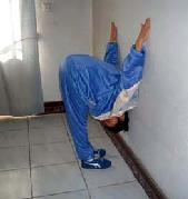 此种酷刑即是迫使法轮功学员大头朝下,两手撑地,两腿向上伸直,倒戳在墙边,由包夹或恶警按住腿、脚,然后由恶警用电棍电击心脏部位,长时间受此酷刑者大多头晕、眼部充血,在电棍的电击下心跳加快,呼吸困难。