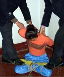 此种酷刑即是将法轮功学员的双腿双盘,用细绳勒紧捆实,双臂扳向背后,铐上双手。铐手的姿势分两种,如图17、18.被绑者几小时或十几小时不被放开,还经常被逼闻臭鞋、脏物,有的干脆被封口。此种酷刑是邪恶逼迫法轮功学员转化时惯用的卑鄙伎俩。2002年12月,在队长值班室,锦州法轮功学员王芳(40岁左右),被恶警董淑霞指使犹大施以此刑长达四个多小时,放开后致使左腿不能走路,失去知觉,左臂不能正常活动,耷拉着,手铐勒進皮肉里,至今仍留有疤痕。