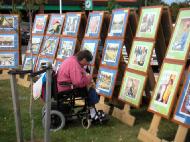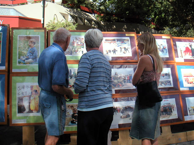 影画尚未完全上架就来了一对老年夫妇,看过照片后,老太太流着眼泪指着法轮功孤儿的照片对学员说:“好可爱的孩子,真是天使般的孩子。”然后拥抱着学员说,“你们干得好,请让全世界的人都知道真相,让我们对邪恶一起喊‘住手!’。”