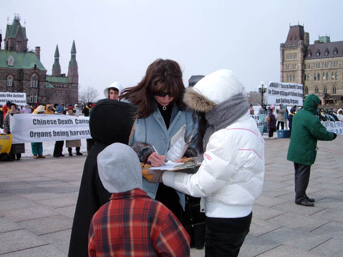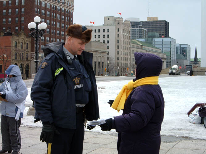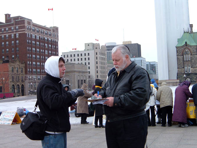 3月15日,渥太华的气候仍在零度以下,北风呼啸。15名法轮功学员坚持在风雪中绝食三天。他们的行动得到了无数善良和正义的人们的支持和关注。人们主动来了解真相,并纷纷签名支持。当地的媒体CITY TV、太阳报、公民报、中央社和CTV NEWS 到现场做了采访。
