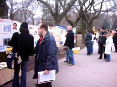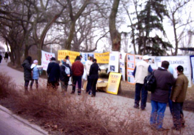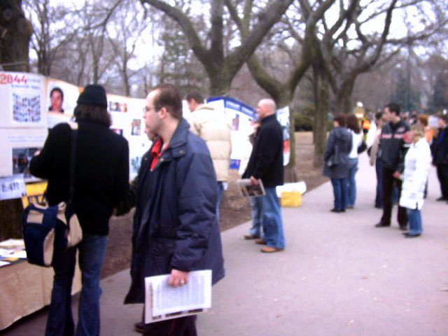当日的天气虽然寒冷,但丝毫不影响游人和准备参加一些其它活动的人停下匆匆的脚步观看展板了解真相。有些来不及观看展板的人也不想错过,主动拿了资料后才走。尤其是许多人在看过关于揭露苏家屯集中营黑暗内幕的特别报道后,对恐怖集中营对修“真、善、忍”的法轮功学员使用残暴的手段,摘取盗卖器官后,立即焚尸灭迹的恶行表示愤慨。人们了解到中共恶党比二战时期纳粹的残暴有过之而无不及时,非常同情法轮功学员所遭受的迫害,纷纷主动签字,谴责中共的邪恶暴行,支持呼吁制止这场惨绝人寰的迫害。
