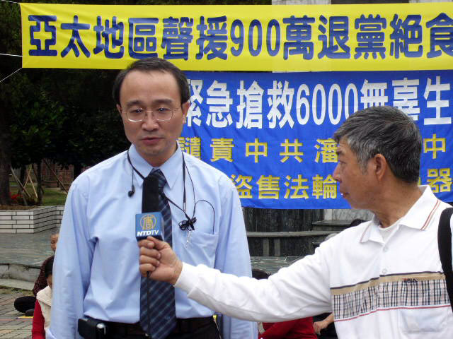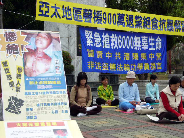 【明慧网2006年3月22日】2006年3月21日,台湾嘉义地区的法轮功学员在嘉义公园绝食静坐,强烈抗议中共对法轮功的迫害,声援900万勇士退出共产党,并揭露中共沈阳苏家屯集中营杀活人取器官的黑幕。多家媒体记者到场采访,法轮功学员、中正大学艾教授向一家无线电视台记者揭露了中共的残暴罪行。
