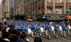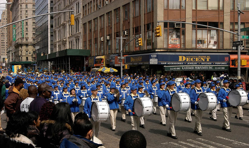 百老汇39街上,行人驻留,游客止步,众人都被法轮功学员游行的盛大声势所震撼吸引,手机、照相机、摄影机此起彼落。人高马大的纽约骑警开道, 壮观的横幅“法轮大法”、“真善忍”打头,紧跟其后的天国乐团鼓号声响彻云霄。