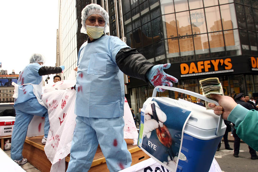 平板拖车上真实的再现了最近揭露出来的2001年起中共在苏家屯罪恶滔天的兽行:恶警把法轮功学员非法押到苏家屯,泯灭良知的医生在活着的法轮功学员身上摘取眼角膜、肾脏等器官,谋取血腥暴利。