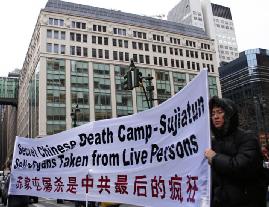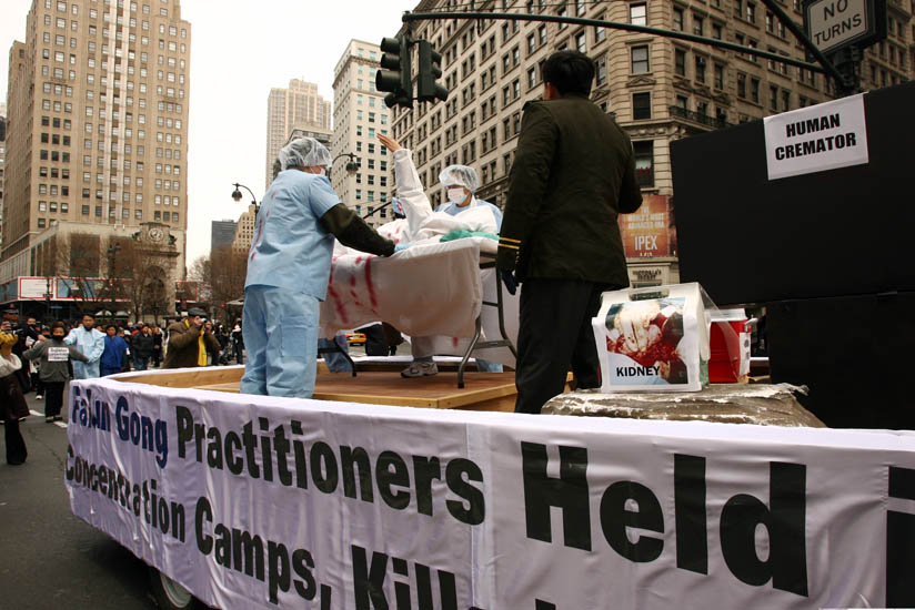 平板车的两侧和后面是巨大的横幅,告诉着世人“法轮功学员在苏家屯集中营被活体摘取器官,中共牟取暴利”。