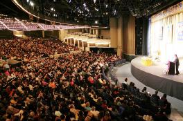 曼哈顿麦迪逊花园剧场是纽约著名的大剧场之一,可容纳5500观众。屋顶上满天繁星散发着柔和的光。蓝底金字的竖幅“慈悲能溶天地春 正念可救世中人”悬挂在主席台的两侧,激励着参加交流会的同修。师父法像和两侧“真善忍”、“法轮常转”的法轮图形庄严的悬挂在主席台上方。数盆丰硕高雅的插花点缀在主席台上,芳香四溢。主席台中间是一个精致的长桌,前方是金色的中英文“真善忍”。台上同修的发言清楚的传到剧场的每一个角落,四千多名大法弟子用心聆听着同修发言。一切显的那么庄严美好。