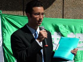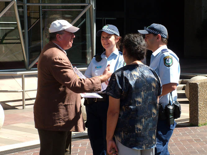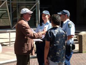![]() 法轮功学员在法庭外向警察讲真相 |