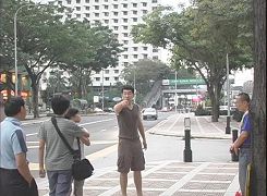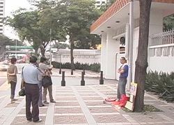 ![]() 中使馆人员(中)出来干扰记者和正在炼功的学员 |