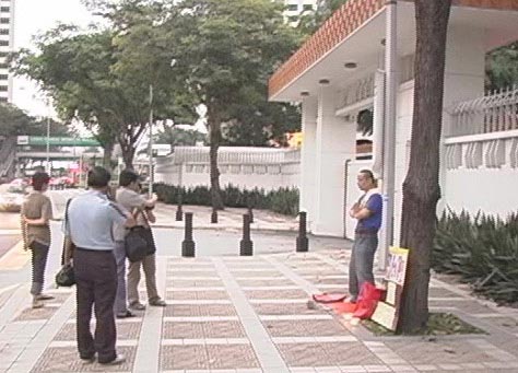 法轮功学员张旭峰为抗议中共虐杀大陆同修,于4月7日开始绝食72小时,并在4月8日傍晚6时,来到到中共驻马来西亚使馆前为受难者烛光悼念。15分钟后,一辆中使馆的轿车刚好進入使馆,被正在采访的记者摄入镜头。驾驶有关车辆的使馆人员过后很慌张的出来,要抢夺记者的照相机和摄相机。在场采访的大纪元和新唐人记者提醒他这里不是中共的地方,是马来西亚,记者有采访和拍摄自由,他没有权力这么做。