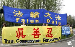 ![]() 法轮功学员在FAIRMONT OLYMPIC酒店外抗议 |