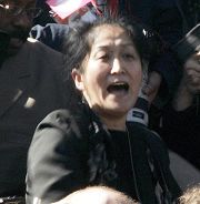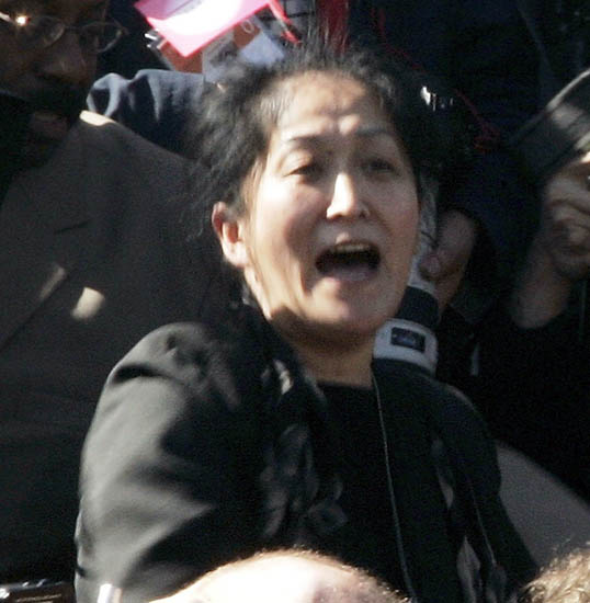 【明慧网2006年4月21日】(明慧记者综合报道)中共党魁胡锦涛昨天(20日)上午访问白宫。当美国总统布什在白宫南草坪举行迎接仪式时,当布什总统演讲完毕、胡锦涛开始讲话后,一名华裔女士突然在负责现场转播的摄像机旁拉开黄底红字的横幅并以中英双语大喊“法轮大法好”、“停止迫害法轮功”等字句,令所有在场人士震惊。这位女士的喊话和抗议长达两分多钟,随后才被保安人员带离现场。此突发事件过程中全国电视直播的画面立刻变成分屏,电视观众可以同时从电视上看到现场上这名华人妇女喊话的情形,以及布什和胡锦涛的反应。
