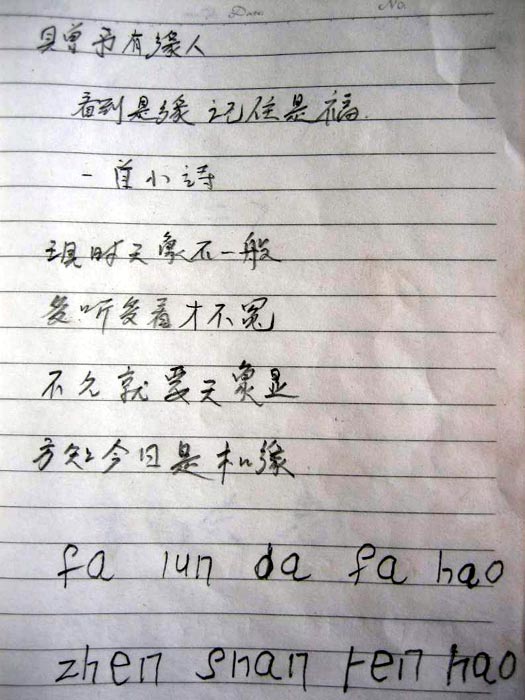 我老伴刘静航的遭遇也是如此。2000年2月6日晚,海淀公安分局把她抓走。没几天,说是她参与组织了除夕夜国内外众多学员去天安门证实法,被江泽民定为“要彻查的大案、要案”,而被转送到北京市公安局七处。我是她的丈夫,可一直也没收到七处的通知,我去派出所问警察,他们说:“没给你通知,就是不想让你知道,如果允许你和她联系,就会告诉你的,回家等着吧!”直到2000年5月末,从监号里出来的人,偷偷告诉我关押刘静航的地点和监号,叫我赶快给她送些钱和衣物,说她实在太苦了。第二天我就去了七处看守所。可是接待室里的警察矢口否认关押着刘静航,还追问我消息是从哪来的,我说是因204案被抓的法轮功学员……那人急忙阻止说:“你别说了,我们这里没这么个人,你快走吧,以后也别来了,不然把你也牵进去!”说着就把我推出了接待室。