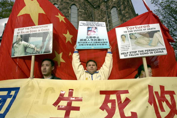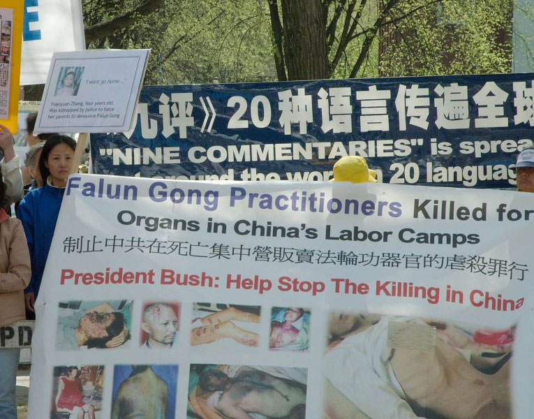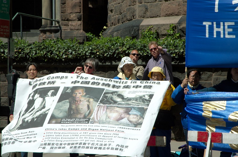 文章结尾是一位从德国慕尼黑来的西人法轮功学员:“她举着一张显示在中共监狱被拷打的憔悴囚犯的海报,上面写道‘中共集中营出售人体器官牟巨利’。她讲话时,泪水顺着脸颊滚落。”