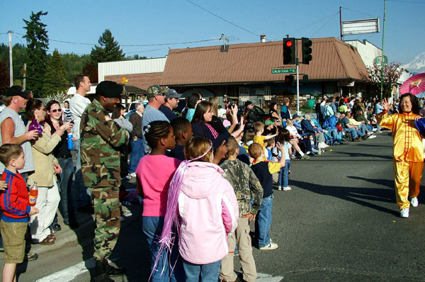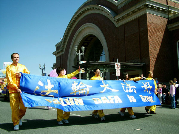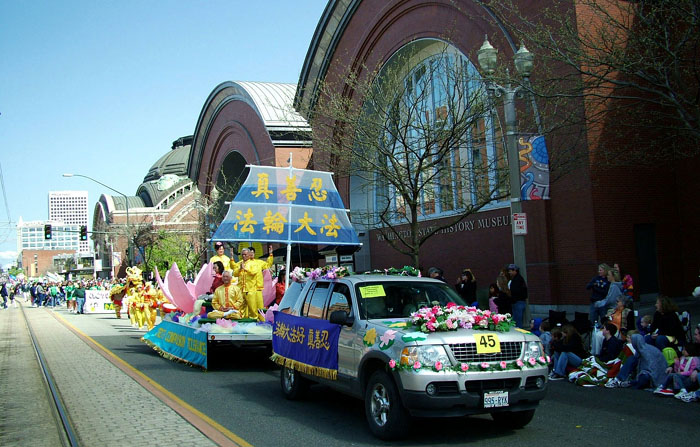 【明慧网2006年4月28日】2006年4月22日,美国华盛顿州法轮功学员第4年应邀参加了一年一度的,由电视转播的水仙花节大游行,在华州第一大雪山Mt. Rainier的映衬下,学员们把大法的美好播种在华州民众的心中,许多观众向学员竖起大拇指叫好;主办单位主席两度前来问候学员。法轮功队伍获得了“Director's Award”奖。