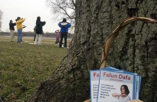 报道说,这个星期六早上,风很大,但是十几个法轮功学员仍按每周惯例来到库珀河公园炼习法轮功。他们站成一个圆形,双眼微闭,举着双手,公路上来来往往的车辆,降落的喷射客机,甚至头顶飞翔的大雁,仿佛都打扰不了他们。