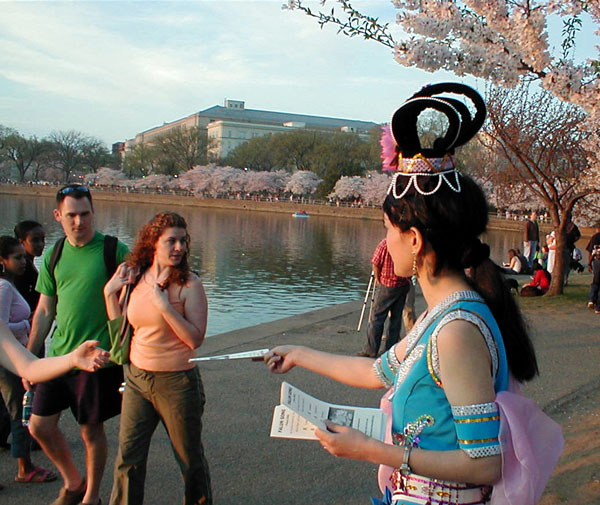当天下午,法轮功学员表演了仙女扇子舞、腰鼓,并演示了法轮功功法,受到游客热烈欢迎。功法表演期间,有的观众跟着台上的表演比划着动作。表演结束后,身穿仙女服的法轮功学员被络绎不绝的游客邀请合影拍照,成了杰弗逊纪念堂前的一道景观。有的游客带着孩子和“仙女们”合影,并说,孩子们刚才被台上的演出深深吸引,还跟着学打坐和结印的动作呢。