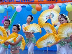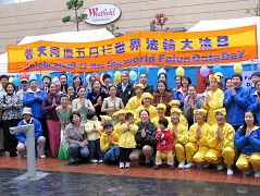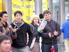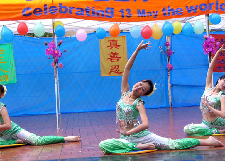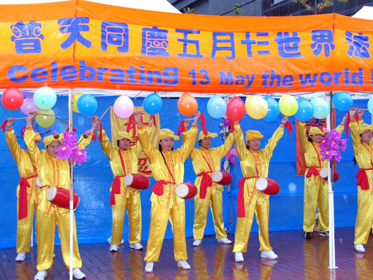 虽然奥克兰阵雨时时,但不减大法弟子和观众的热情,大法弟子精彩的舞蹈、歌曲博得观众阵阵的热烈掌声。路过的行人也纷纷驻足,不少游人还用自己的摄像机拍下了这美好的场面。