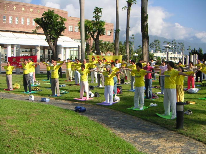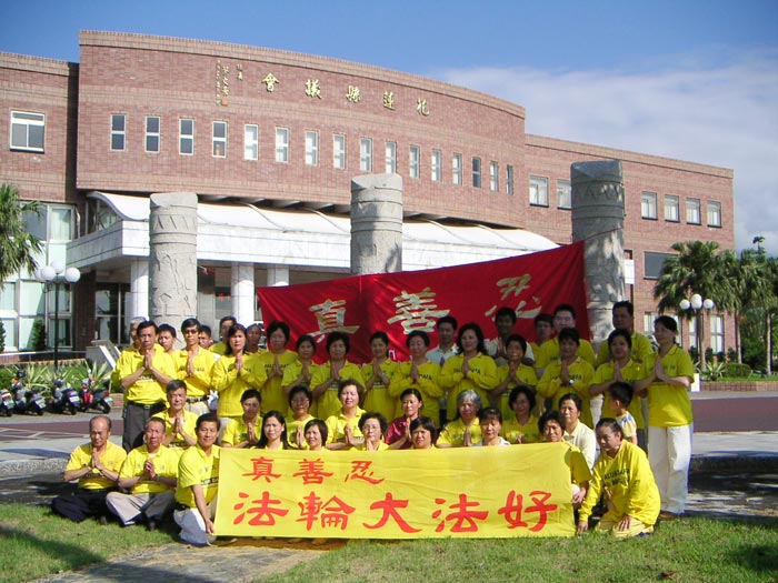 当天天气晴朗,天空碧蓝如洗,花莲学员聚集在县议会外的广场上炼功。明媚的晨光中,在碧绿如茵的草坪上炼着五套功法,构成一幅祥和优美的画面,路过的行人纷纷注目。学员们集体合十存影,恭祝慈悲伟大的师尊生日快乐。