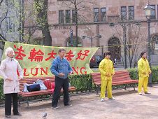在公园中心的一侧,学员拉起了“法轮大法好”的横幅,横幅前学员们轮番的表演腰鼓和演示法轮功的五套功法。