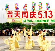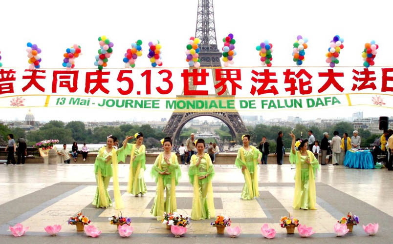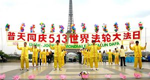 Alexis首先向观众们介绍了5月13日是一个特殊而伟大的日子,法轮功创始人李洪志先生从1992年传法至今,已走过了14个年头,如今法轮大法洪传世界80多个国家,不同国家、民族与种族的修炼者共同沐浴着法轮佛法带来的无限美好,普天同庆法轮大法日。Alexis并代表法国大法弟子祝师尊生日快乐。