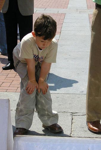 一边是祥和优美的功法演示,另一边是惨烈的迫害,这强烈的反差立即引来了人们的关注,很多人索要真相报纸和VCD,也有一些急于参加节日盛会的人,接过资料后,边走边读,当读明白时,特意返回来签字支持法轮功;有的人当场学习五套功法。